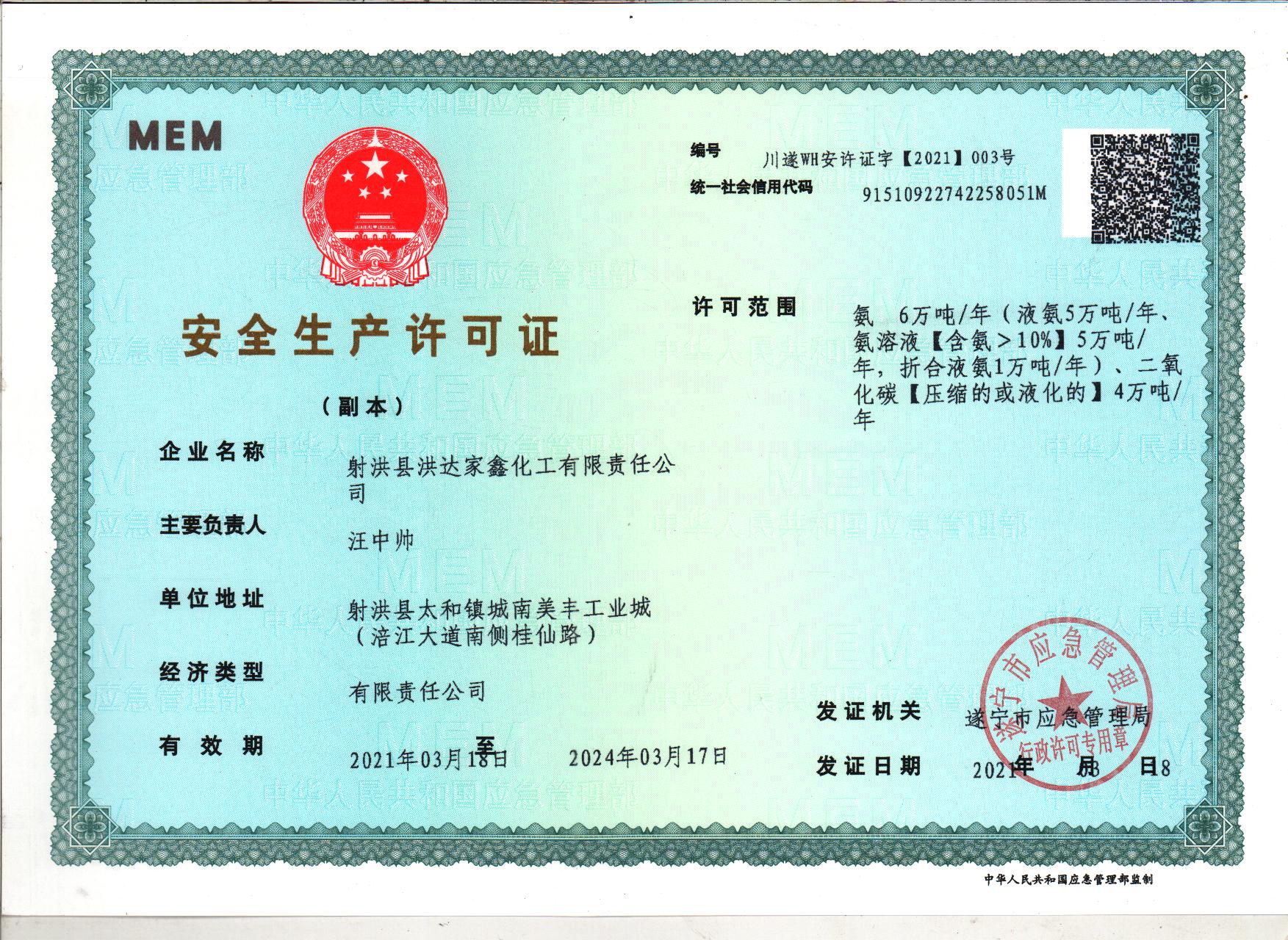 射洪縣洪達(dá)家鑫化工有限責(zé)任公司是一家年產(chǎn)6萬(wàn)噸合成氨涉農(nóng)企業(yè),成立于2002年8月。公司2005年12月通過環(huán)評(píng)驗(yàn)收。 |